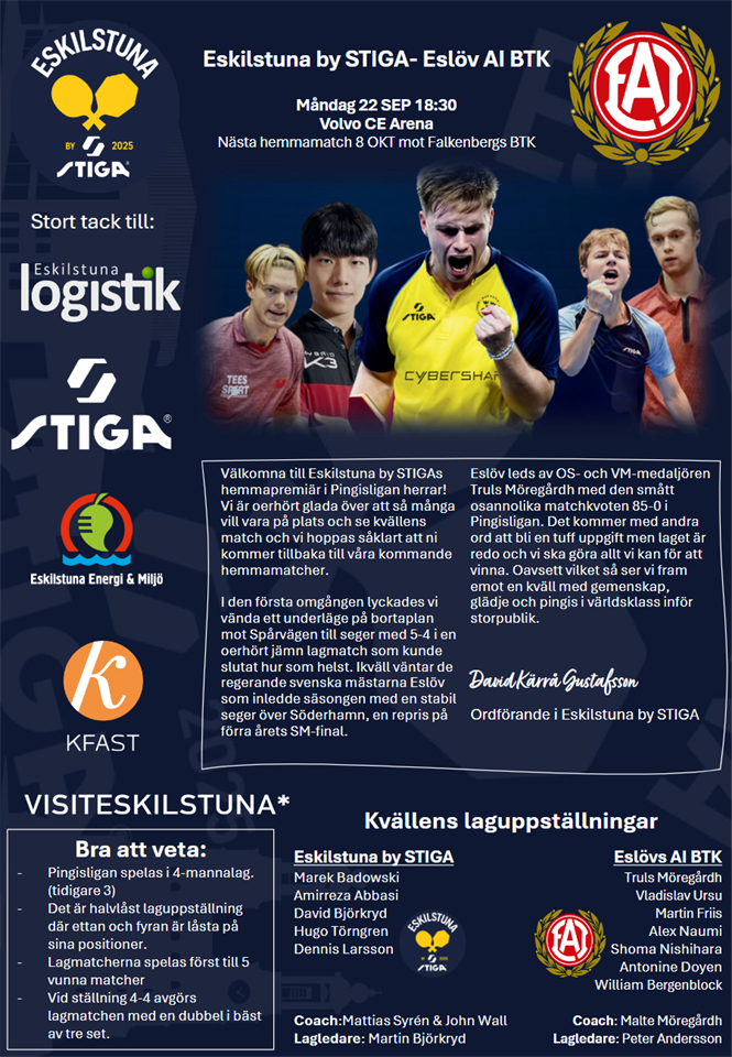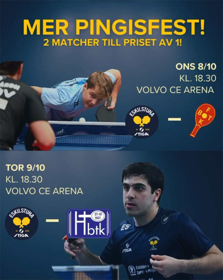 Dubbelmöte!💥🔥 Efter en fantastisk hemmapremiär med otroligt stöd från publiken är vi redo för två nya matcher på hemmaplan!!! Kom och heja fram laget! Få biljett till båda matcherna till priset av en!👏🌟 Ons 8/10: Eskilstuna by STIGA vs Falkenbergs BTK Tors 9/10: Eskilstuna by STIGA vs Halmstad BTK BILJETTKÖP SKER GENOM DENNA LÄNK Eskilstuna by STIGA 1 okt 2025 0kommentarer